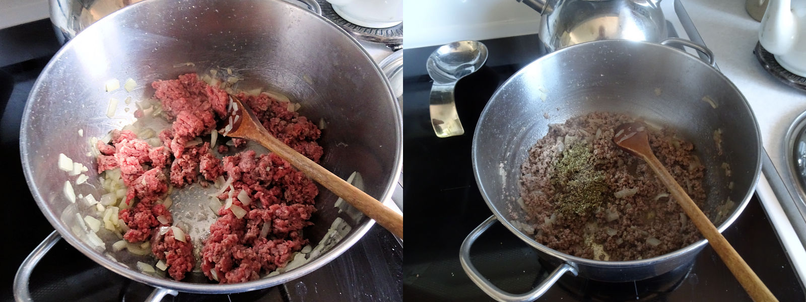I added 300 g (2/3 pound) of lean ground beef and sauteed until the beef was cooked through. I broke the beef up with the back of a spoon while it was sauteeing. Then I added 1 clove of minced garlic, 10 ml (2 tsp) of Italian seasonings, and 5 ml (1 tsp) pepper. I cooked for a minute or two until the seasonings were fragrant.