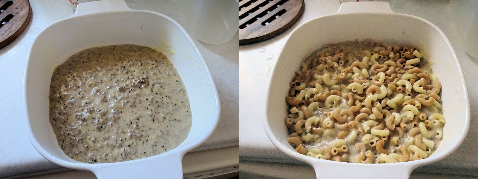 Spray a casserole with baking spray. Put ½ the meat mixture into the casserole. Cover with ½ the macaroni. Spread ½ the salsa over the macaroni. Repeat with remaining meat mixture, macaroni, and salsa.
