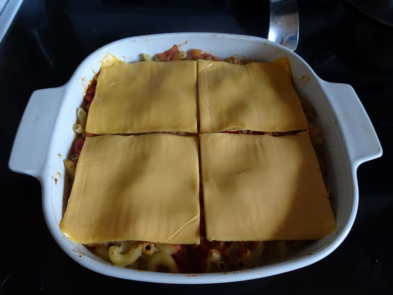 I sprayed a casserole dish with baking spray and put 1/2 the meat mixture in the casserole. I put 1/2 of the macaroni over that and spread 1/2 the salsa over that. Repeat with the remaining meat mixture, macaroni, and salsa.