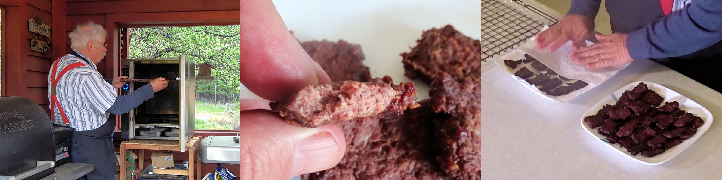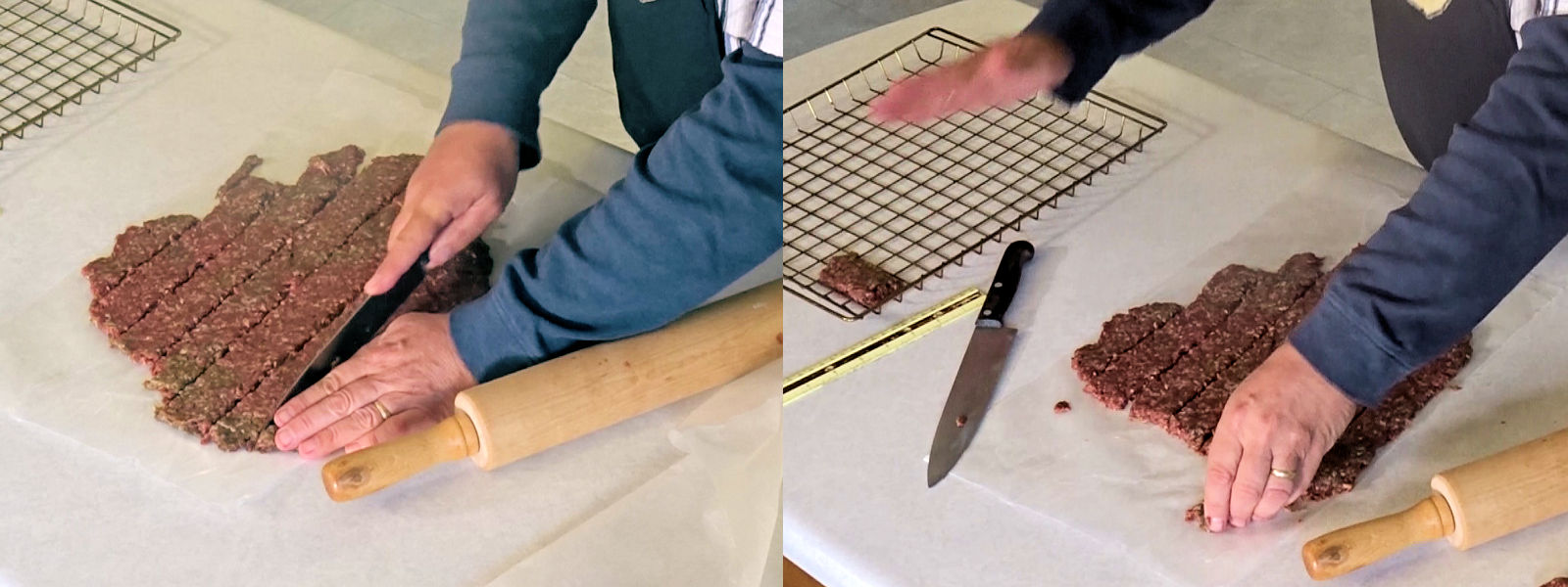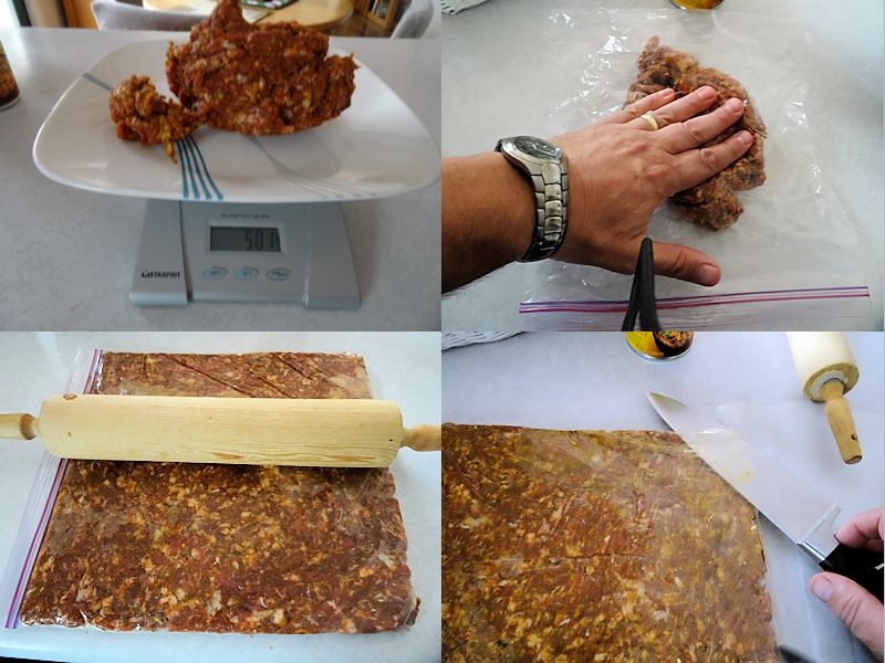 Roll ½ of the meat to ¼ inch thick between two pieces of wax paper. Cut to desired width and length and put the pieces on the smoking rack.