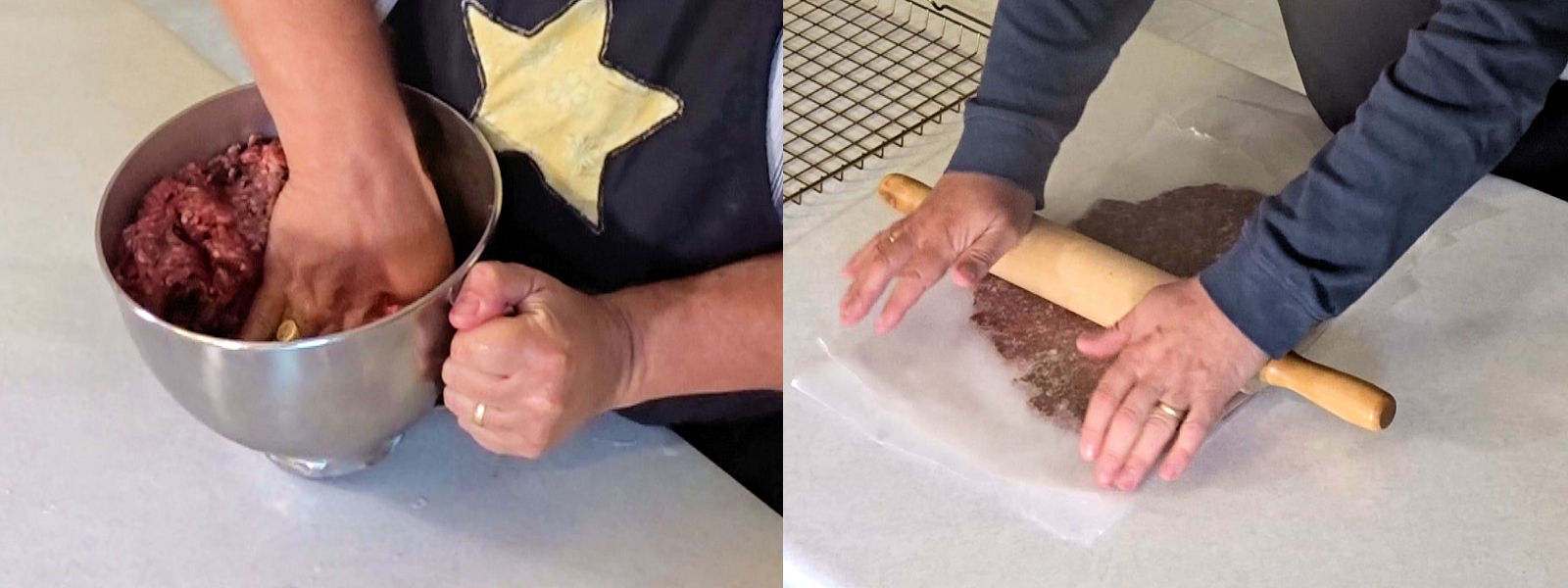 Put 1/2 the meat between two pieces of wax paper and gently roll to 1/4 inch thick.