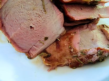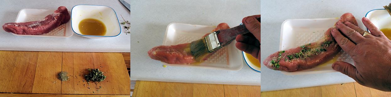 I started by mixing together 1/4 cup honey, the grated peal of an orange and the juice of an orange. I brushed that liberally over the tenderloin. I chopped a tablespoon of fresh thyme (you could substitute 1 teaspoon of dried). I added 1 teaspoon of dried rosemary to that and rubbed the herbs into the tenderloin.