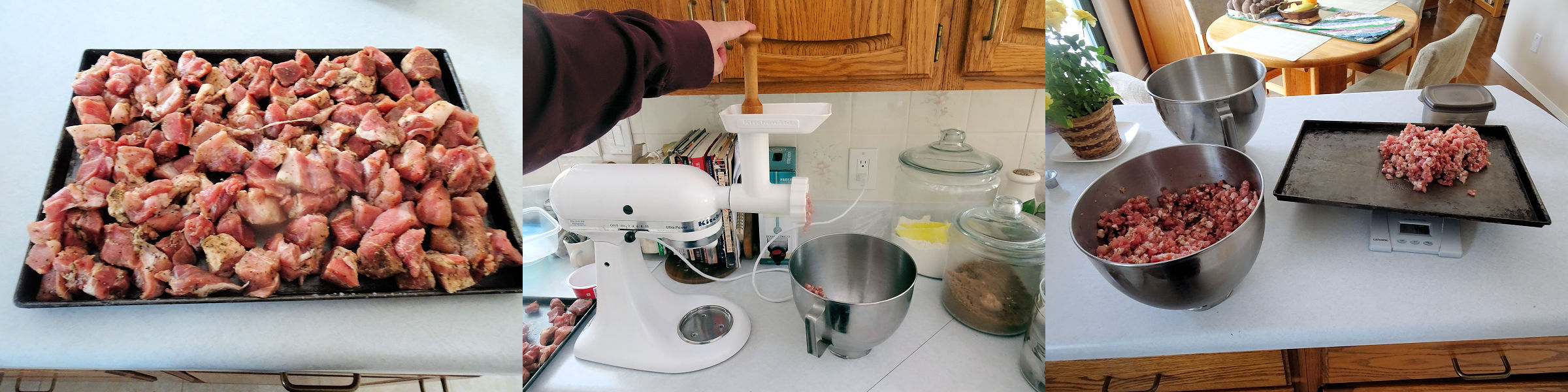 I put the meat on one layer on a tray and put it in the freezer until it formed a crusty surface. Then I ran it through the coarse plate on my KitchenAid. I put the pork in the fridge for an hour to chill.