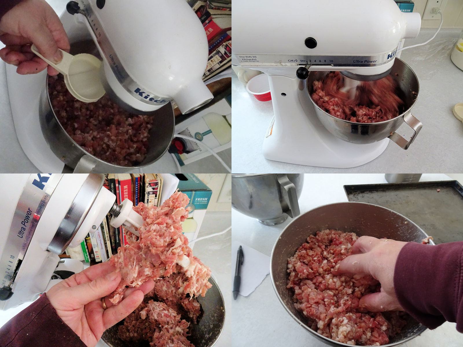 Put the ⅔ of the meat in the bowl of a stand mixer with the paddle attachment. Beat at medium speed until the meat is pasty and sticks to the bowl and beater. About 4-5 minutes. Refrigerate the meat for one hour.