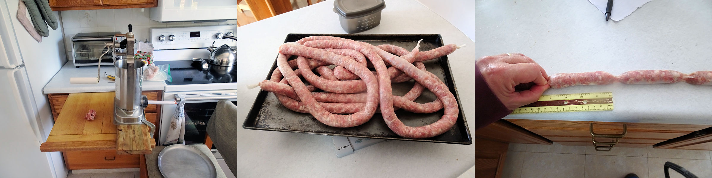 I used my LEM stuffer and used 22 mm (3/4 inch) collagen casings to make the sausage. It took about 1.8 meters (6 feet) of casings. After stuffing, I pinched the sausages every 4 inches.