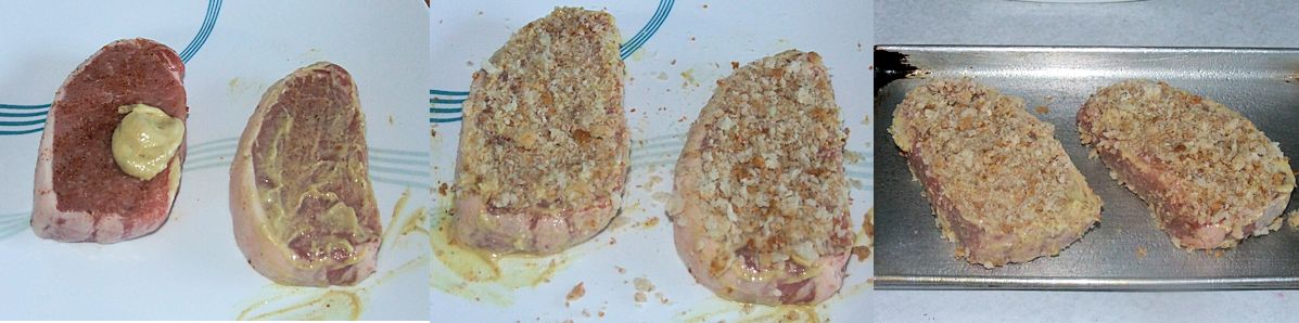 Turn the pork chops, apply the seasoning, spread with the mayo mixture and press in crumbs.