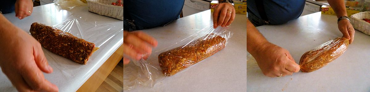 13. Grasp the ends of the plastic wrap and roll the fatty on the counter to compress it.