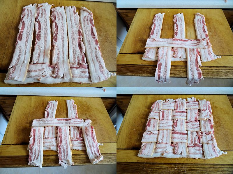 Make a bacon weave. How many strips of bacon you will need depends on how wide the strips are. Lay one strip of bacon left to right on the counter. Put one strip at a right angle with one end under the first strip. Place a second strip next to it with its end over the first strip. Continue until you have enough strips to be the same width as the first strip.