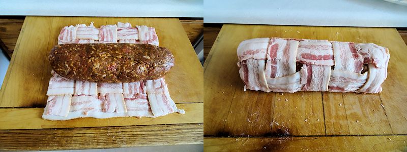 25. Take off the plastic wrap and roll the fatty in the bacon weave.