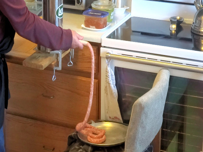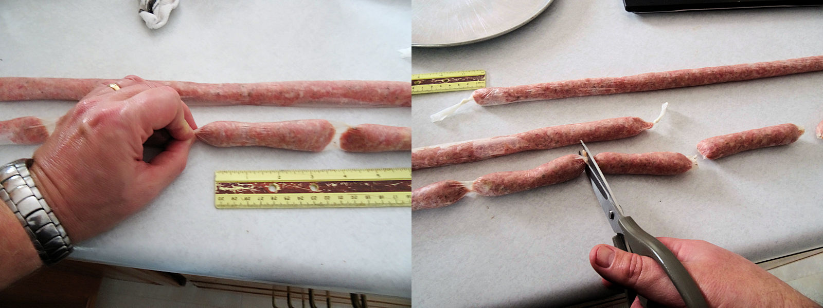 When the sausage is stuffed, Measure 4 inches and press a flat spot. cut at this flat spot and continue cutting all the sausage.