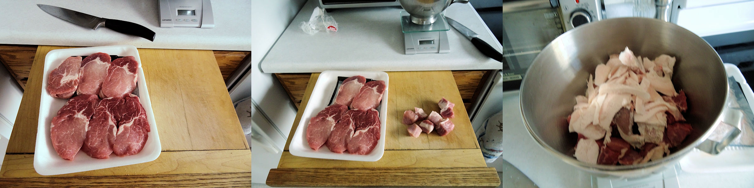 I would normally use pork shoulder to make my sausage but they had pork sirloin chops on sale and they are a little leaner than shoulder so I added some pork fat I had in the freezer. In all, I had 1 kg (2.2 pounds) of pork.