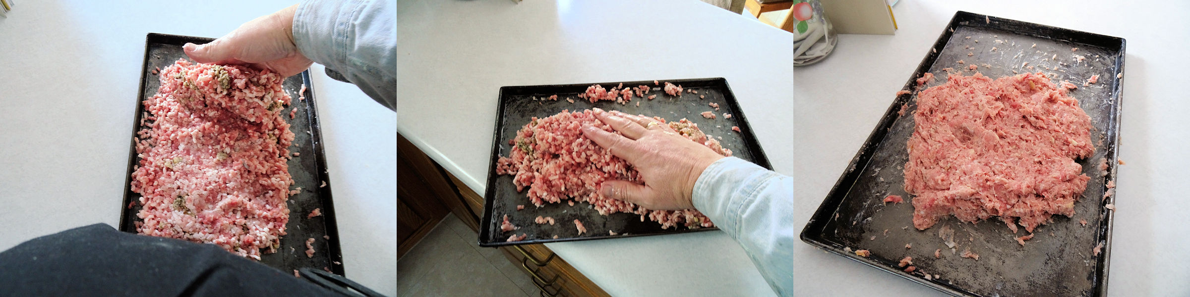 - Fold the top half of the meat towards you and press flat. Turn the tray 1/4 turn, fold the top over and press flat. Continue folding and pressing for 3 minutes.