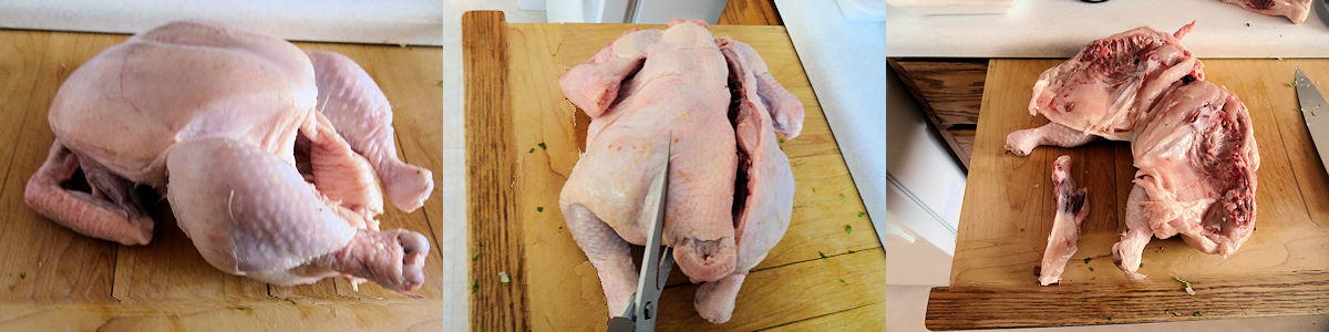 Then I spatchcocked the chicken. This involves cutting down both sides of the spine with shears to remove it. Then you cut out the breast bone and the chicken will lie flat. I have done a video for Rosemary Chicken that shows how to spatchcock a chicken.