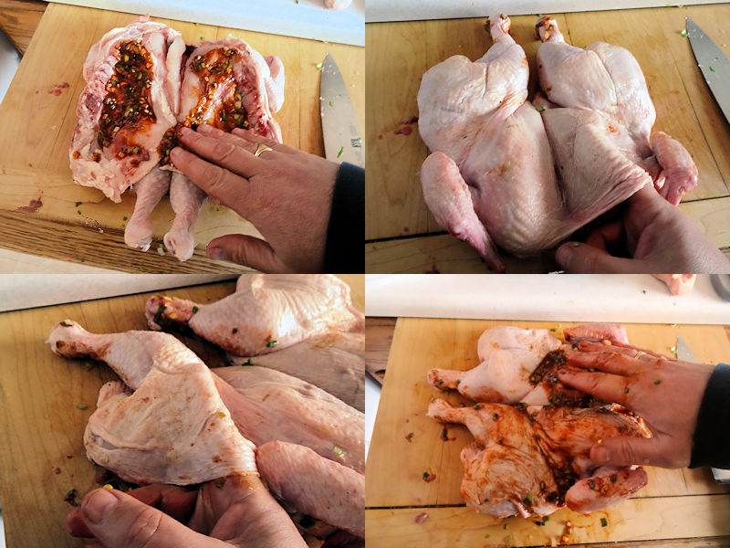 I rubbed some marinade onto the nonskin side of the chicken.
