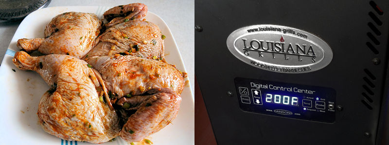 Normally, chicken like this is done on a grill. However, I wanted to add more smoky flavour so I decided to use my Louisiana Grills Pellet Smoker. A pellet smoker lets you have great control over the heat easily. I decided to cook it low for 2 hours to get smoke flavour and then to increase the heat at the end to get the skin right.