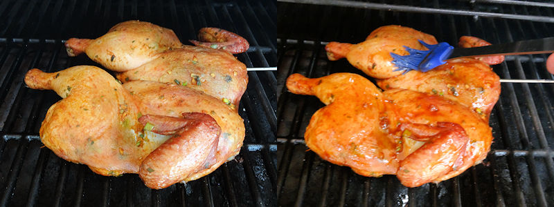 After this smoking, I brushed the bird on both sides with brushing sauce and increased the temperature in the pellet grill to 325 F.
