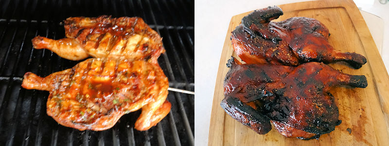 12. When the internal temperature of the chicken gets to 155 F, brush with the brushing sauce on both sides of the chicken every 15 minutes.