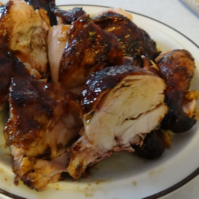 If you do not have a smoker, you could cook this in a 350 F oven for about 2 hours, brushing with brushing sauce for the last 45 minutes. It won’t be as good as there won’t be smoky undertones. Make sure the internal temperature of the breast and thighs are over 165 F.