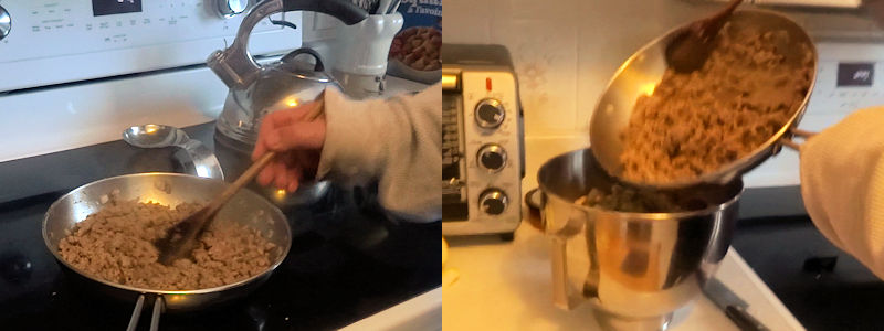 I put 300 grams (3/4 pounds) of Italian sausage in the fry pan and sautéed until cooked through and crumbly. I added it to the bread cubes and mixed.