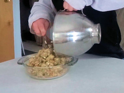 - Sprinkle the chicken stock over the bread and mix to moisten.