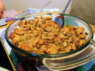 This is a great stuffing. It has all the seasoning notes of a traditional stuffing with a richness from the sausage which also adds some different seasoning input. The apple adds just a touch of sweetness.