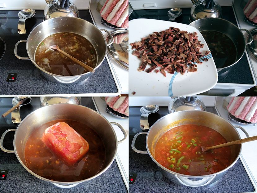 I added 3 cups of beef broth,, 3 cups of water, the jerky and 2 cups of frozen diced tomatoes (from my garden). You could substitute 3 cups canned diced tomatoes.