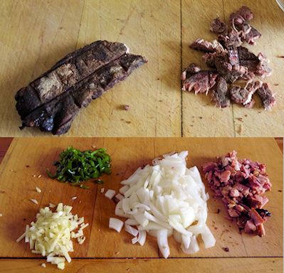 I started by tearing up jerky until I had 2 cups. Then I chopped 1 1/2 cup onions, a tablespoon of garlic and 1/3 cup green chili peppers. I also cut up 1/4 cup of end pieces from my back (Canadian) Bacon. You could just use bacon or ham.