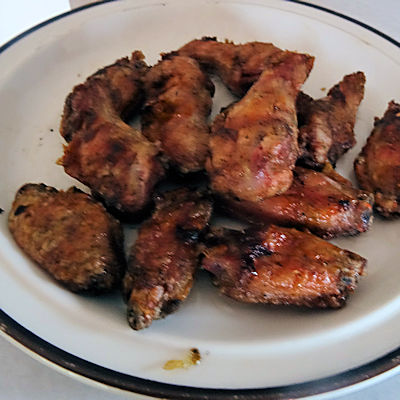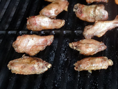 I preheated my Louisiana Grills smoker to 350 F. You can also do these in a 350 F oven on a rack over a tray. I put the wings on and smoked for 25 minutes.