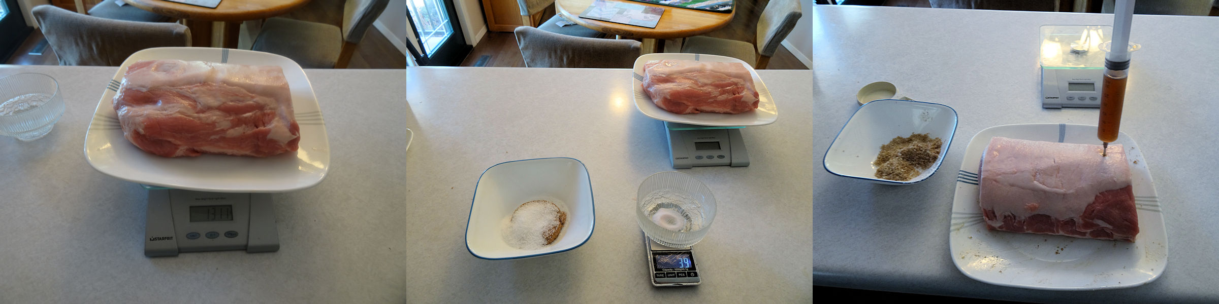 I reduced the sugar from my regular cure mix as I would be injecting maple syrup.