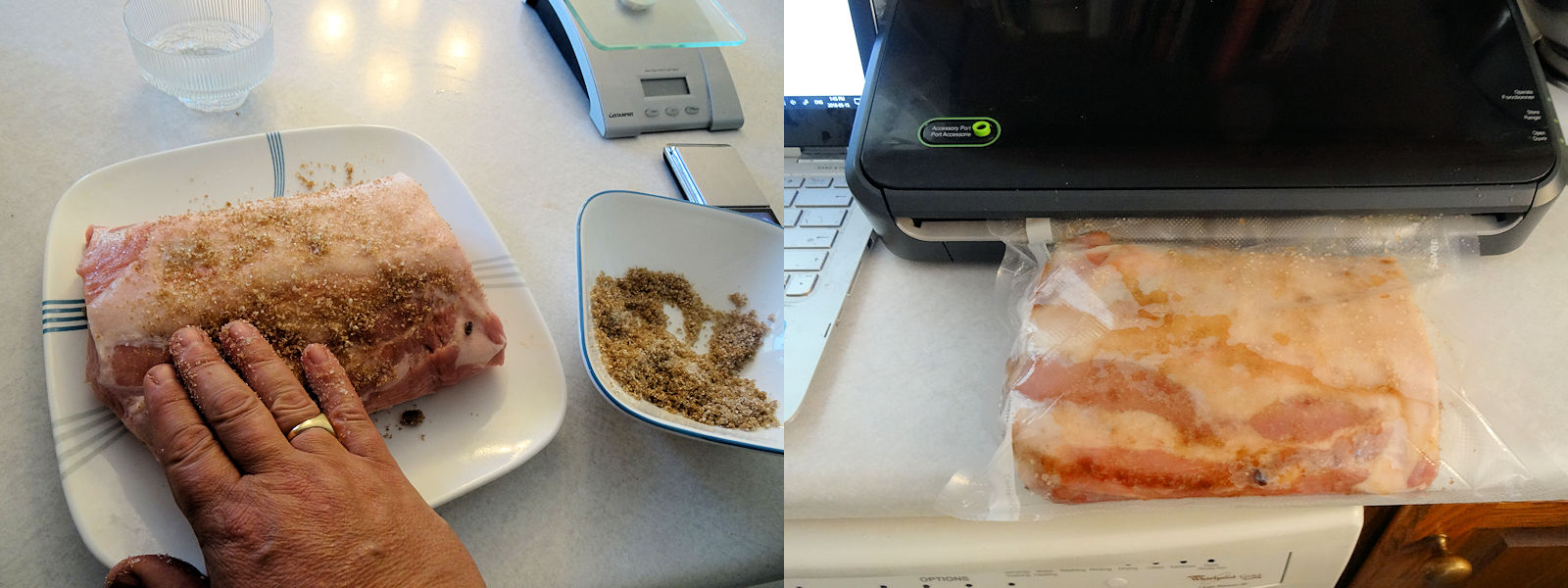 Rub the cure mixture all over the pork loin. Put the pork loin in a resealable plastic bag or a vacuum sealer bag. Scrape any syrup or rub that fell onto the plate or tray into the bag. Seal the bag but don’t suck the air out if using a vacuum sealer bag.