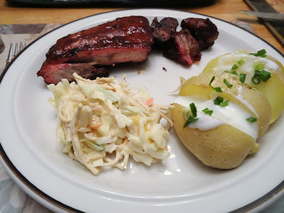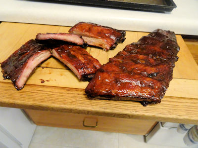 I put them back in the smoker for 30 minutes to set the sauce. Then I cut them into two rib slices for serving.
