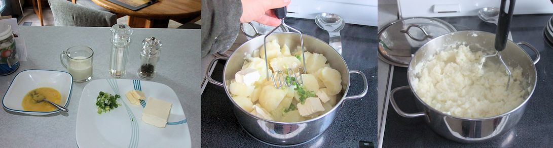 While the potatoes are cooking, I get all the ingredients prepared to mash into the potatoes. I measure the milk, beat the egg, chop the green onions and portion out the butter and cream