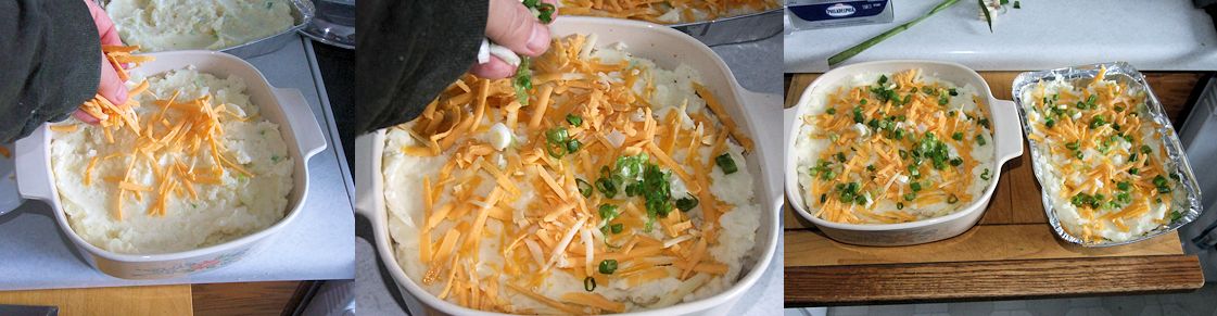 I sprinkle the cheddar cheese and green onions on top. I foil the casserole to be frozen and put it in the freezer. The one I will be serving is covered and goes in the fridge until tomorrow’s feast