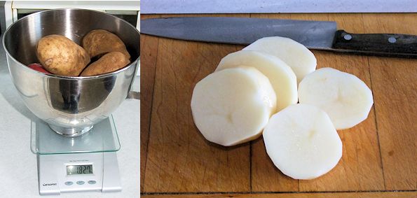 I start by weighing out my potatoes, peeling them and cutting them into chunks. The recipe calls for Yukon Gold potatoes but I actually like the texture from plain old russet baking potatoes better. I’m sure the fact they are also cheaper at this time of year has nothing to do with it.