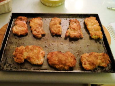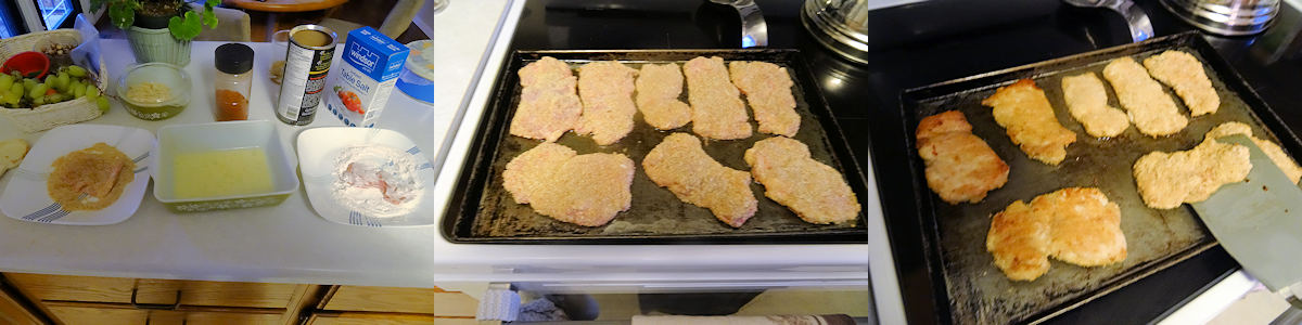 I set up a breading station with the flour, salt and pepper on a plate, the egg mixed with the milk in a shallow casserole and the breadcrumbs mixed with the taco seasonings on a plate. You can use commercial taco seasonings or my recipe from a prior post.