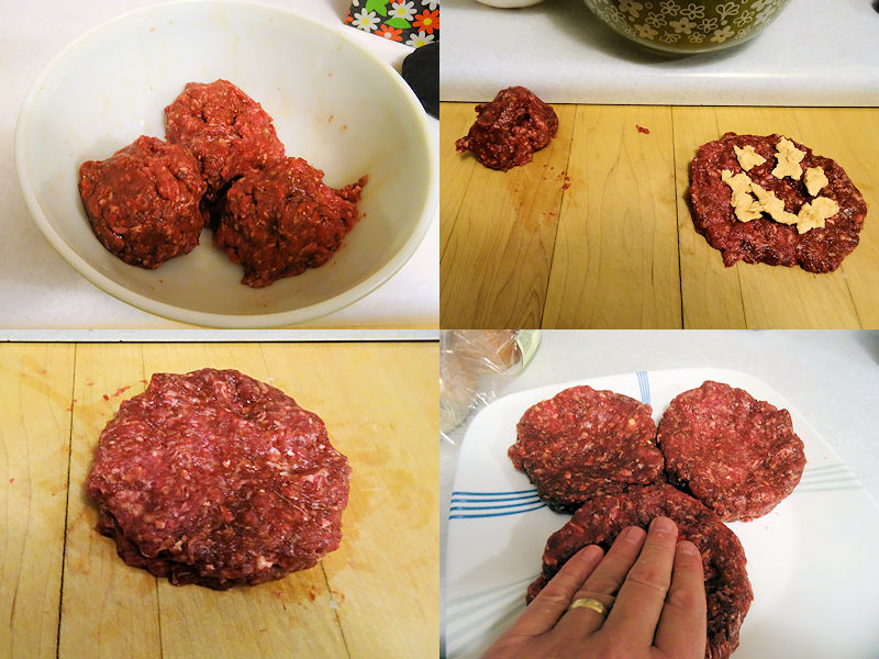 I separated the ground beef into 3 balls. I split each ball in half and flattened one half. I put 1/3 of the butter on the flattened half. I flattened the other half and pressed it on top of the buttered half to make a patty. I repeated this with the other two balls.