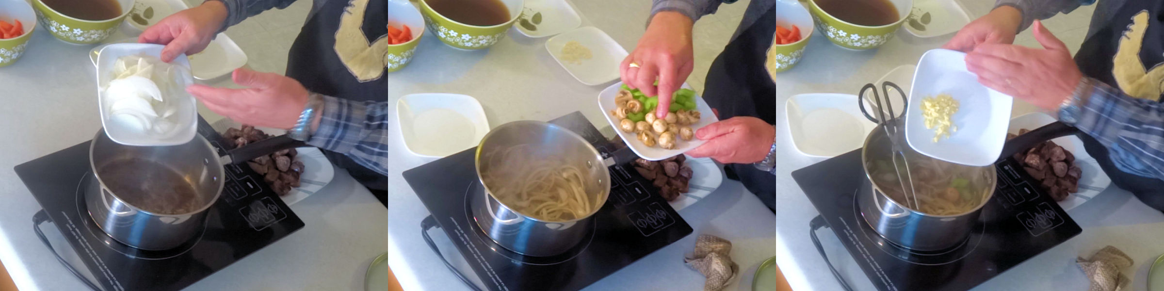 - Add the remaining oil and sauté 1/2 medium onion sliced lengthwise. Cook until just starting to brown. Add 250 ml (1 cup) button mushrooms (cut any large mushrooms in half), and 1 stalk celery, sliced. Cook for 3 to 4 minutes until the mushrooms stop giving off liquid. Add 15 ml (1 tablespoon) finely chopped garlic and cook for 1 minute.