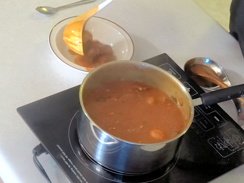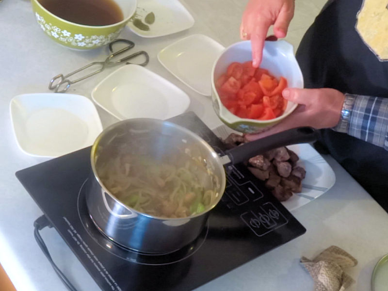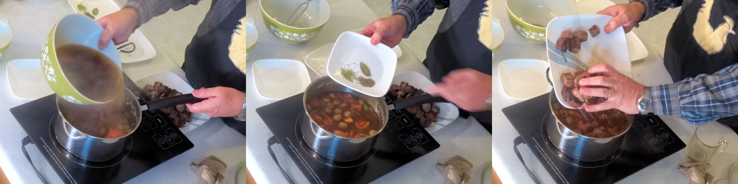 - Heat a teaspoon of vegetable oil over medium heat in a pot. Brown the beef three batches to brown. Add a little more oil for each batch. If you put them all in the pan at once, they will give off liquid and won't brown properly