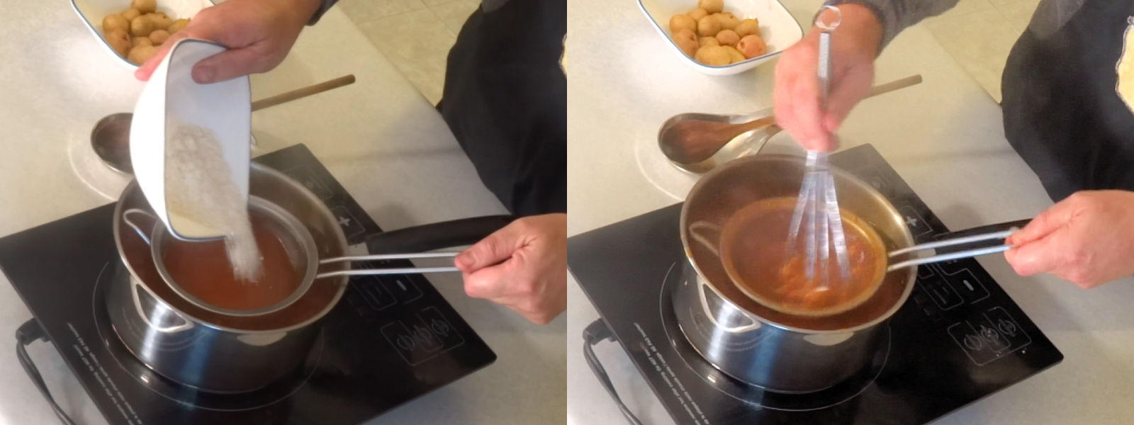 - Put a fine sieve in the pot and add 75 ml (1/3 cup) of flour, 25 ml (2 tablespoons) at a time, whisking it into the liquid in the sieve and pushing it through the sieve.