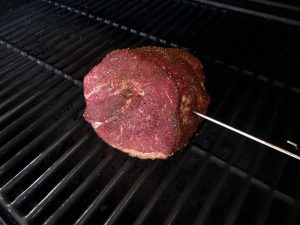Another way of adding flavour to beef is to smoke it. So I preheated my smoker to 230 F and put the meat in. I smoked it to an internal temperature of 140 F, about 3 hours. If you don’t have a smoker, you can do this in an oven and it will still be tasty.