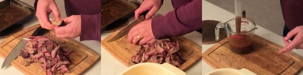 I let the beef rest under the foil for 2 hours. I took the beef out of the pan and pulled it into shreds, discarding any large pieces of fat. I chopped the threads to about 1/2 inch lengths.