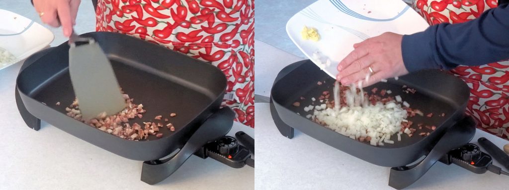 I could use some oil to saute my onions but why not add more flavour? I sauteed 125 ml (1/2 cup) of chopped bacon over medium heat to have it rend fat. When it was starting to colour, about 5 minutes. I added 375 ml (1 1/2 cups) diced onion and sauteed until it was getting translucent and soft, about 4 minutes.