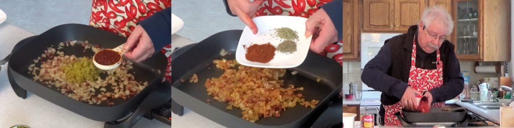 - Add the chili powder, rosemary and thyme. Saute for 5 to 10 seconds.