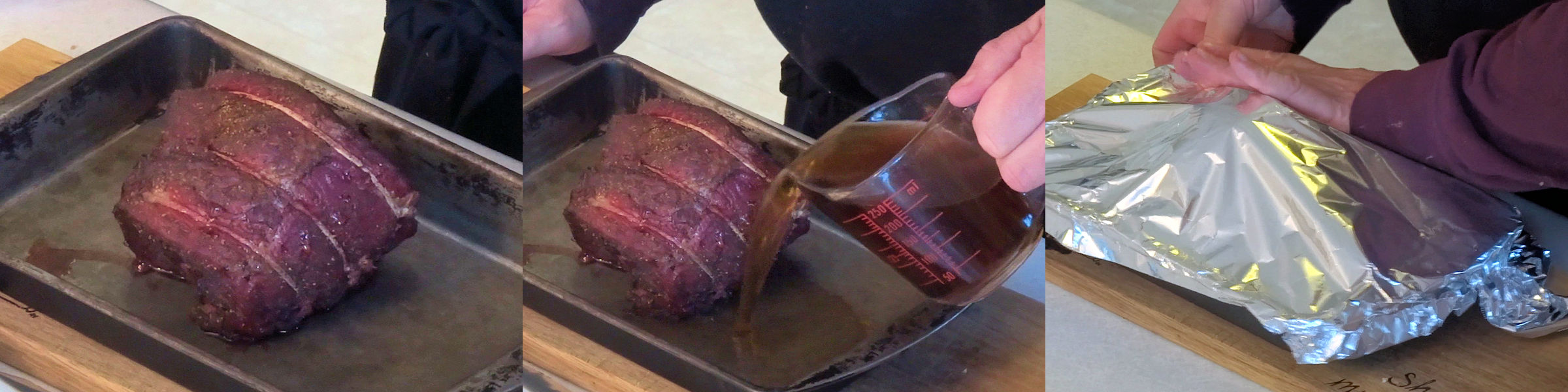 - Put the roast in a roasting pan and add the beef stock. Cover with foil and cook in a 230 F oven until the internal temperature is 203 F.