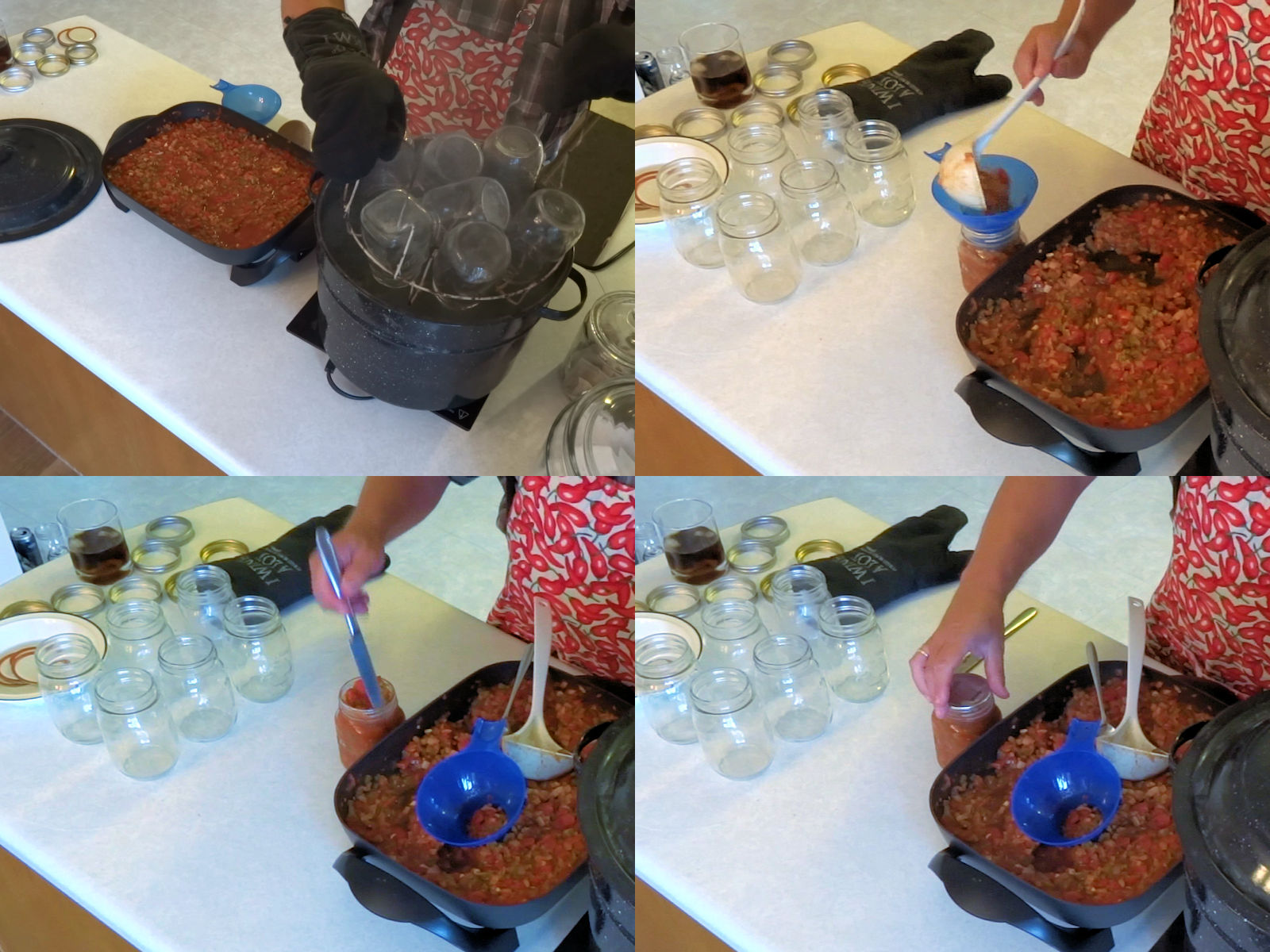 Remove the jars from the hot water canner. Put the sealing lids in hot water to soften the sealing strip.