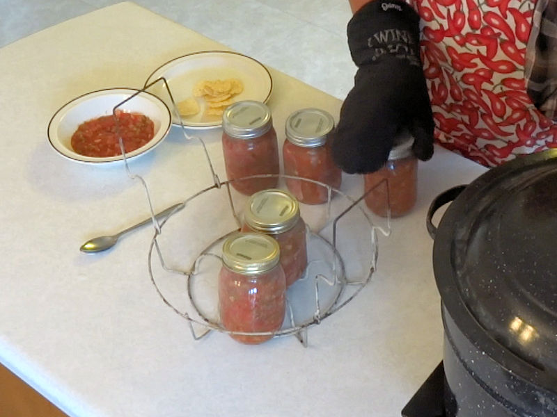 While the salsa was simmering, I filled my hot water canner to the top fill edge and put the canning rack in. I put seven jars in, filled them with water and turned them over on the rack. I put the water over high heat to come to a boil. You will want to boil the jars for 10 minutes.