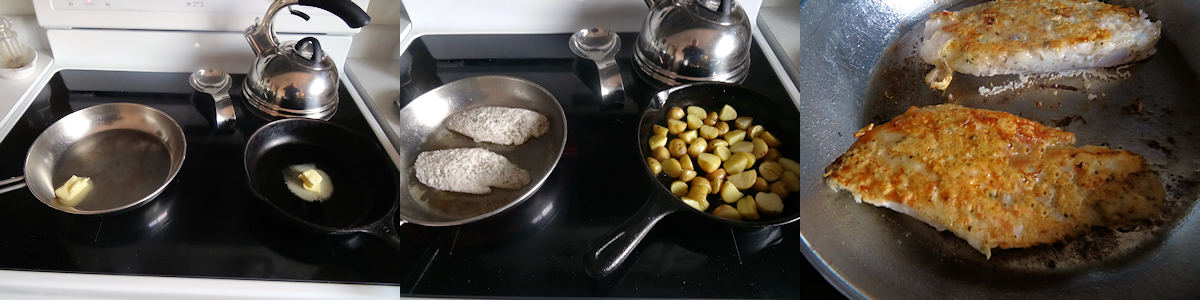 When the butter began to bubble, I put the potatoes in the hot pan and the fish in the cooler pan.