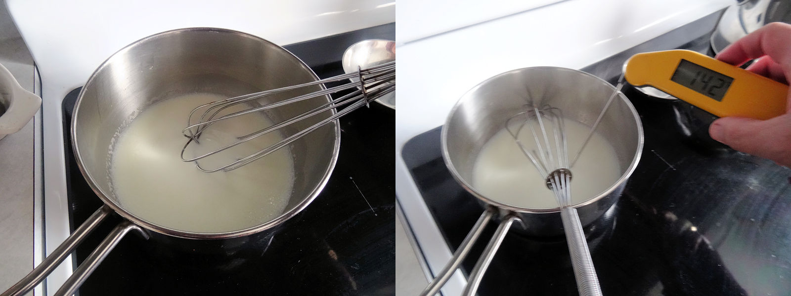 Put the saucepan over medium high heat and cook, stirring, for a couple of minutes. Do not let it boil. You are looking to dissolve the gelatine in quite warm milk. If you have an instant read thermometer, you are looking for a temperature of 135 F (57 C).