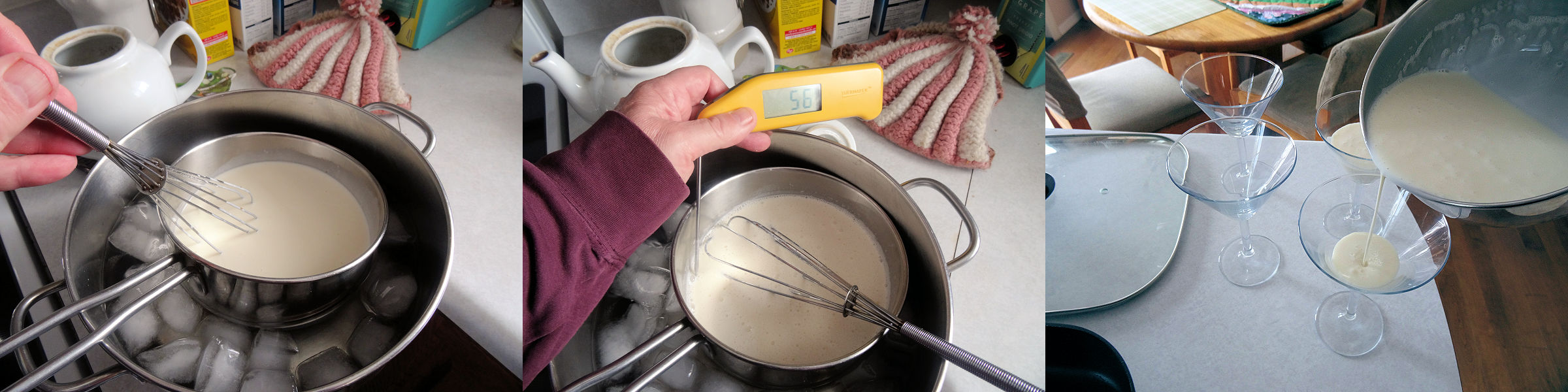 Put the saucepan in an ice water bath and stir until the mixture is slightly thickened like heavy cream. You are looking for a temperature of 55 F (13 C) on an instant read thermometer. It took me about 5 minutes.