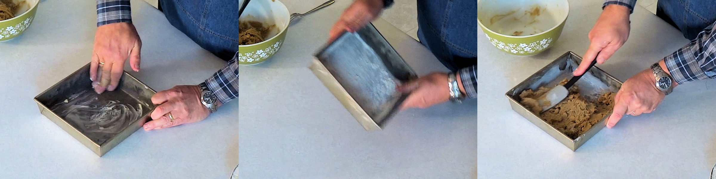Grease and 8 by 8 inch (20 by 20 cm) cake pan with butter. Put 15 ml (1 tbsp) of flour in the pan and shake the pan to coat the bottom and sides. Dump out any excess flour.